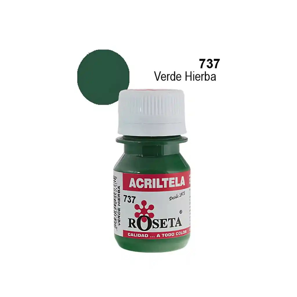 Pintura acrílica textil Roseta con capacidad de 30cc. Colores vivos, acabado mate, alta adherencia y resistencia al lavado y la luz. Ideal para aplicar sobre telas de algodón, dacrón y lino