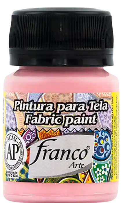 PINTURA PARA TELA FRANCO ARTE ideal para pintar y estampar tela. Súper flexible, buen cubrimiento. No acartona la tela. Es recomendable lavar previamente las telas antes de pintar para eliminar polvo y grasa. Dejar secar por 72 horas y planche por el revés a temperatura media. Manténgase fuera del alcance de los niños. Agite antes de usar. No tóxico. Contiene: 30 cm3