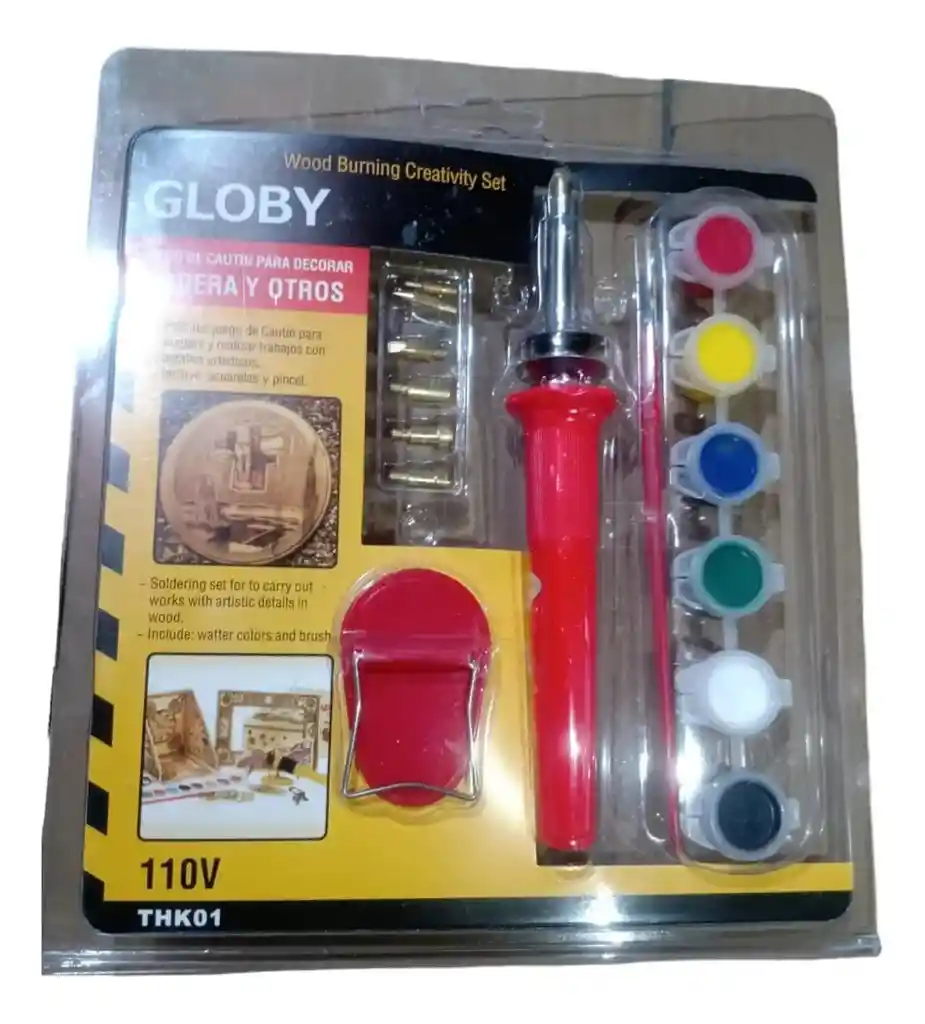 Pirograbador Pirógrafo Tipo Cautín De 30w PLUS: Realiza sorprendentes diseños con el pirografo pirograbador, el cual te permitirá tallar y dibujar en todo tipo de madera y cuero. DESCRIPCIÓN Práctico Pirograbador ideal para aficionados al pirograbado que deseen iniciarse en este apasionante hobby sin necesidad de hacer una gran inversión Funciona a 110 voltios, y viene con 7 puntas tipo estilete intercambiables para hacer todo tipo de trazos y figuras. Tiene una empuñadura de material con aislante térmico. Viene con soporte de mesa. Puede utilizarlo en electrónica para soldar componentes a la plaqueta o circuito impreso. CARACTERÍSTICAS • Tipo: Herramienta • Materiales: Laton – Plastico • Peso: 200 g Kit completo • Puntas intercambiables • El cautin debe ser alimentado a tensión/voltaje de 120V • Temperaturas de hasta 950 grados centigrados MEDIDAS Largo: 18,5 cm Ancho: 3 cm Peso: 79 g QUE INCLUYE LA COMPRA X1 Pirograbador X6 Puntas X1 Cepillo X6 Tintas X1 Base