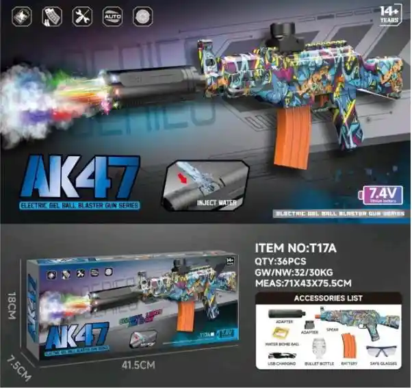 La AK47‑T17D es una pistola de hidrogel con sistema de emisión de humo no tóxico, ideal para quienes buscan una experiencia más inmersiva en airsoft, cosplay, rodajes y fotografía. Su diseño inspirado en el icónico AK47 destaca por su presencia y acabado detallado.