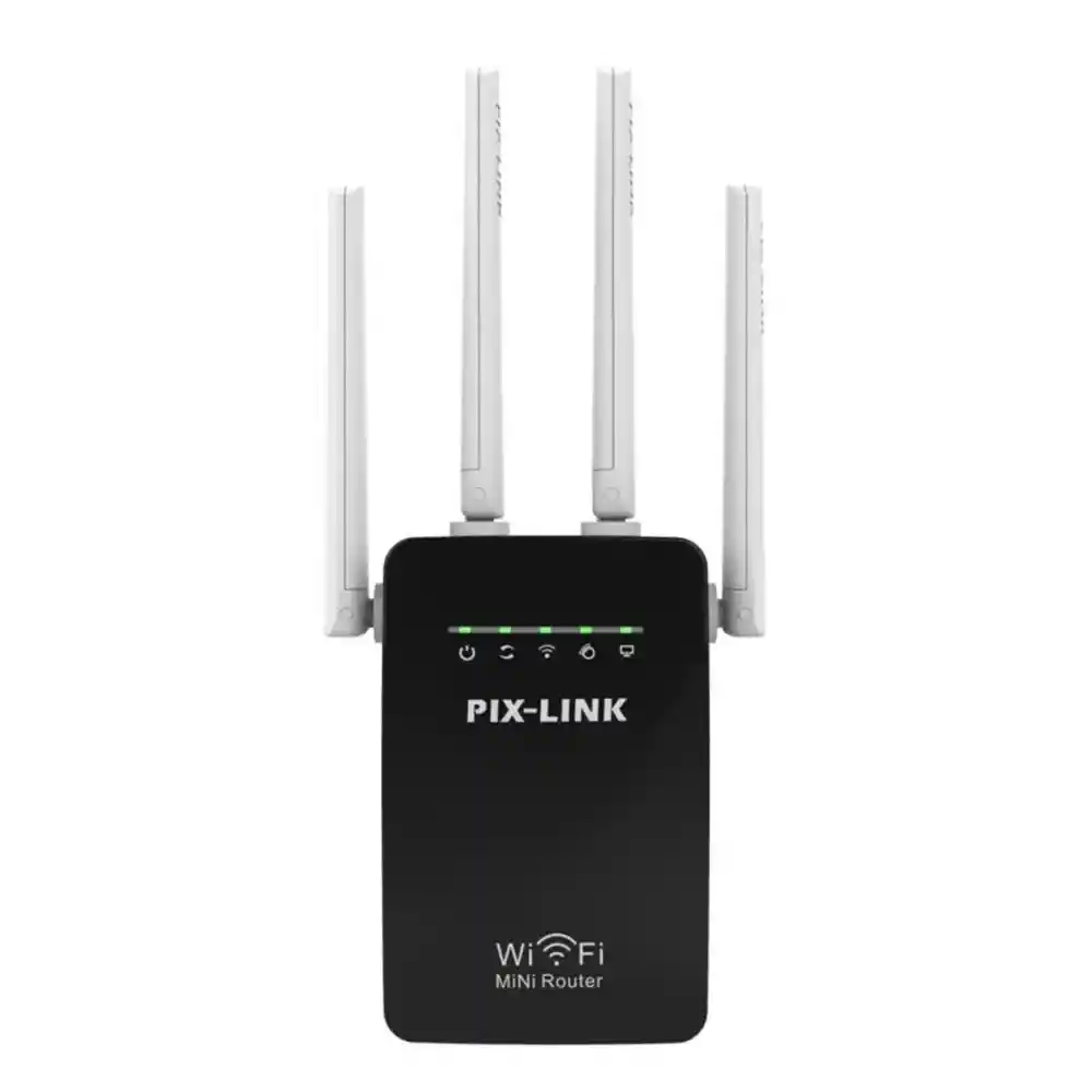 Pixlink - Repetidor Router Inalámbrico, Punto de Acceso, Extensor de Alcance 300Mbps, Amplificador de Señal WiFi, 4 Antenas Externas, WR09 Principales características 1. Cifrado de seguridad inalámbrico sencillo con solo presionar el botón WPS 2. Botón de selección de función: selección de operación multifunción que le brinda una situación de red especial 3. Indicador LED: compartir las condiciones de trabajo de un dispositivo en cualquier momento 4. RJ- 45 puertos Ethernet: comparte 2 puertos LAN/WAN Ethernet de 10/100 Mbps, lo que le proporciona múltiples opciones. 5. Simultáneamente admite conexión de red inalámbrica 2,4G velocidades de transmisión de hasta 300Mbps Parámetro de rendimiento: – Área de cobertura: interior: 30 m, exterior: 50 m – Interfaz: puerto WAN, puerto LAN (1 x 10/100 Mbps) – Velocidad de señal: 2,4 GHz, 300 Mbps – Seguridad inalámbrica: compatible con WEP, WPA de 64/128 bits – PSK / WPA2 – PSK, 802.1x – Potencia de transmisión: menos de 20 dBm – Entrada: CA 100 – 240 V, 50/60 Hz – Salida: 5 V/1 A Múltiples funciones: Extensor de alcance WiFi (repetidor): amplía la cobertura WiFi de una red inalámbrica existente Punto de acceso inalámbrico: convierta una red cableada en una red inalámbrica Enrutador inalámbrico: cree una red inalámbrica privada Ac750 al instante Requisitos del sistema: • Toma de 110 voltios • El cliente WLAN debe admitir al menos el estándar de cifrado WPA. • Punto de acceso WLAN y cliente WLAN con asignación automática de dirección IP (DHCP) • Reenvío de protocolos basados en IPv4/Protocolo de resolución de direcciones • El nombre de red (SSID) del punto de acceso WLAN debe configurarse como "visible". Lo que obtienes con tu compra: 1 x Router 1 x Cable RJ45 1 x Manual (idioma español no garantizado) NOTA 1. El modo extensor wifi de este dispositivo se puede configurar mediante un dispositivo inalámbrico como un teléfono inteligente o una computadora portátil. 2. Configure correctamente el modo repetidor al lado del enrutador y luego mueva el repetidor a otro lugar, disminuyendo así los problemas. 30 días de garantía por defectos de fabrica, no daños causados por el comprador