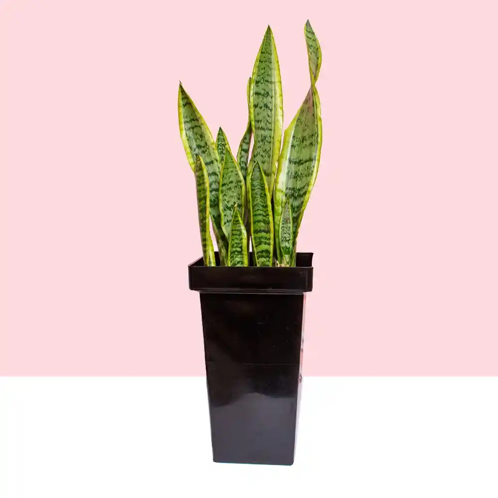 Imagínese una Sansevieria trifasciata, comúnmente conocida como planta serpiente o lengua de suegra, erguida y orgullosa en una elegante maceta negra. Las hojas verticales en forma de espada de la planta, que van del verde intenso al verde amarillo vibrante con llamativas rayas verticales, emergen de la maceta como un grupo de centinelas de la naturaleza acompañada de una matera maceta negra que contrasta con el verde follaje de la planta, proporciona un telón de fondo moderno y elegante que complementa cualquier decoración. Su presencia sencilla aporta un toque de sofisticación y tranquilidad a cualquier espacio, sirviendo como recordatorio de la belleza que se puede encontrar en la simplicidad.
