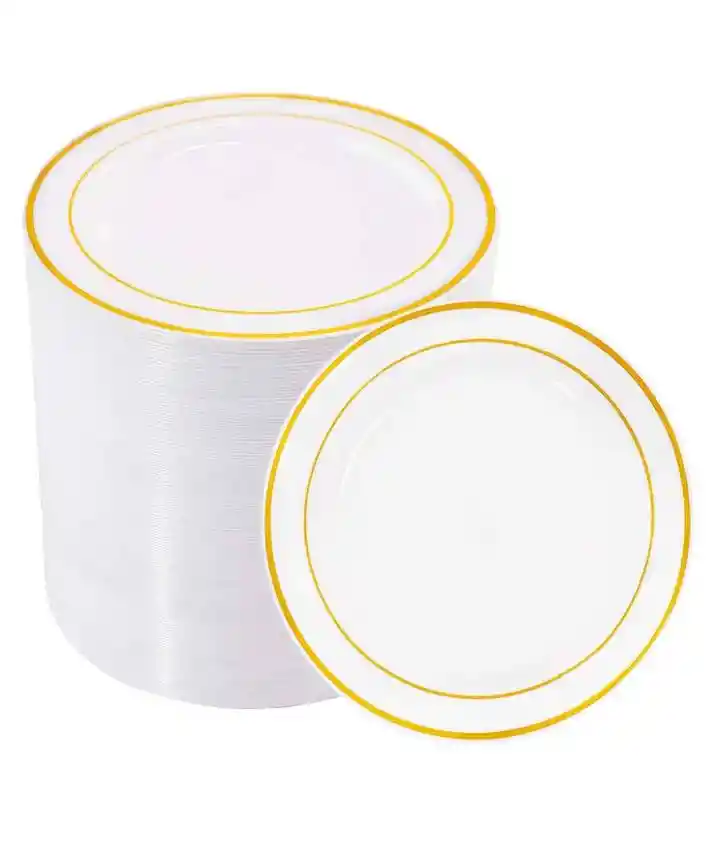 PLATO DESECHABLE PLÁSTICO BLANCO CON BORDE DORADO , ELABORADO EN PLASTICO PESADO. ELEGANTE PRESENTACIÓN PARA SUS POSTRES. CADA PAQUETE CONTIENE 6 UNDS . NO INCLUYE TENEDORES