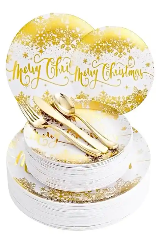 HERMOSOS PLATOS NAVIDEÑOS CON DISEÑO DORADO NO CONTIENE CUBIERTOS EL PAQUETE CONTIENE 6 PLATO 18 CMS Y 6 PLATOS 26 CMS ELABORADOS EN PLÁSTICO DURO ES POSIBLE REUTILIZARLOS