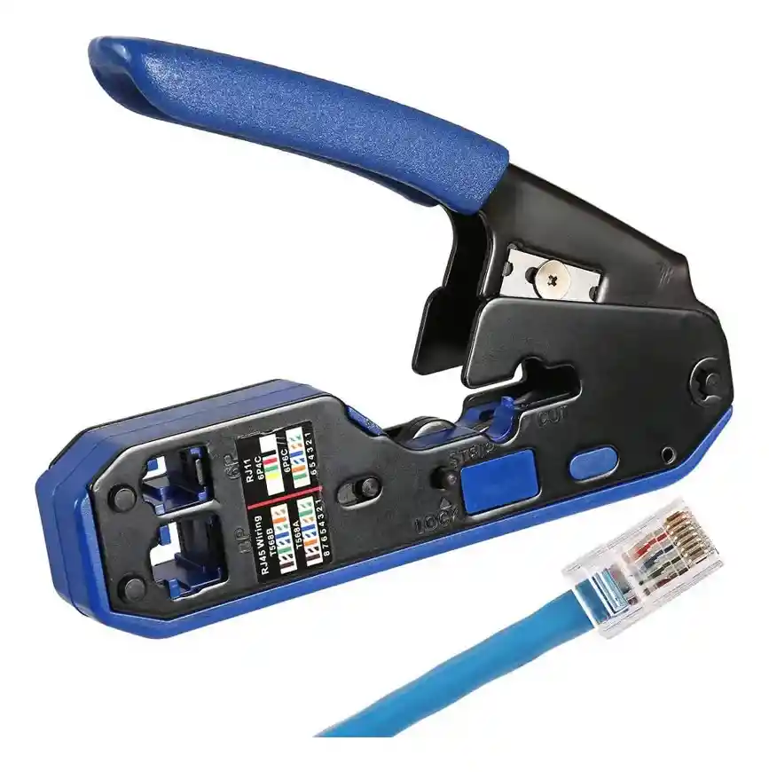 Características: nn1. Herramienta de crimpado en red. nEl pelacables corta el cable Ethernet for adaptarlo al conector RJ45, Cat6, Cat5e, Cat3, RJ11, RJ45. 2. nFácil de engarzar a mano. 3. Diseño compacto y robusto y de alta calidad. n4. Mango antideslizante suave y cómodo. n5. Hecho de acero al carbono de alta aleación. nnnEspecificaciones: nColor: negro+azul nMaterial: plástico y metaln Se utiliza para crimpar conectores RJ11 y RJ45, cortar y pelar cables de red. Cuenta con un mango antideslizante, hoja de corte y sistema de bloqueo. Es compatible con configuraciones de cableado T568A y T568B.