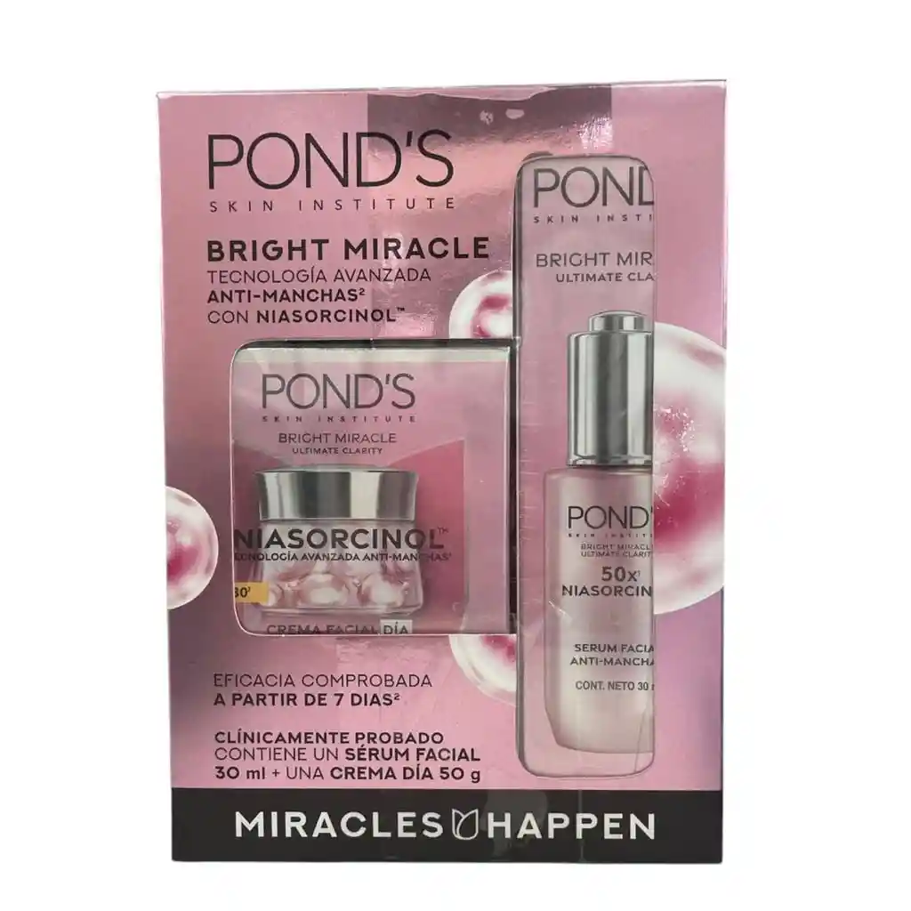 Pond’s Bright Miracle combina una crema de día de 50 g y un sérum facial de 30 mL para ofrecerte una rutina enfocada en unificar el tono y devolverle luz a tu piel. Su tecnología antimanchas actúa desde los primeros días, ayudándote a lucir un rostro más uniforme, fresco y visiblemente renovado. Información del producto: El sérum integra Niasorcinol para atacar manchas y potenciar claridad en solo 7 días, mientras la crema aporta humectación profunda para reforzar la luminosidad diaria. Juntos trabajan sobre tono, textura y brillo, dejando tu piel suave, uniforme y con un acabado radiante. País de origen: Tailandia.