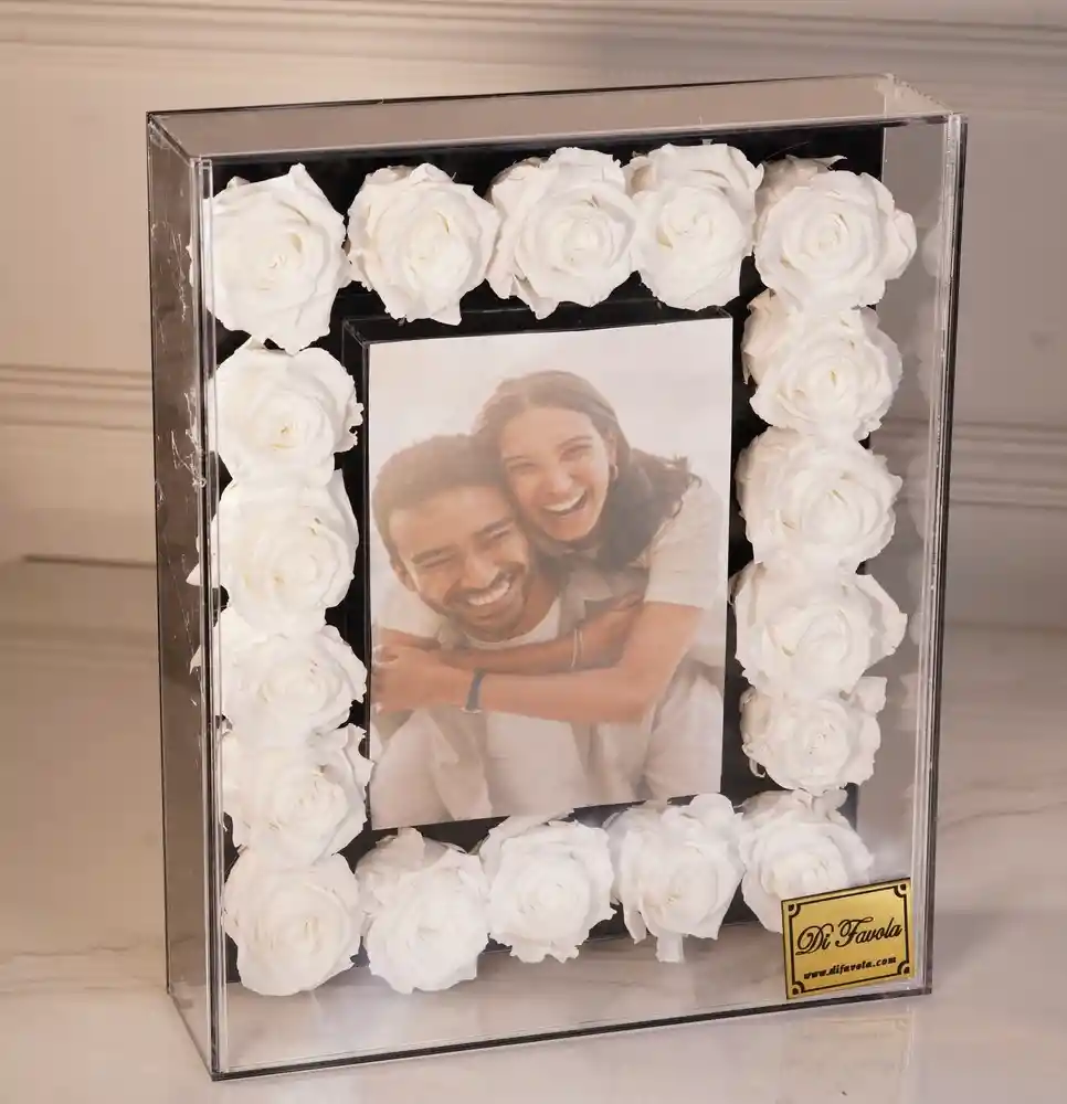 Hermoso porta retratos con cabezas de rosas preservadas tamaño standard en presentación de caja de acrílico envíanos la foto especial ! Incluye tarjeta personalizada Duración rosa: año y medio No necesita agua. Mantenerlas en un lugar fresco y lejos de la luz directa. Perfecto para cualquier ocasión