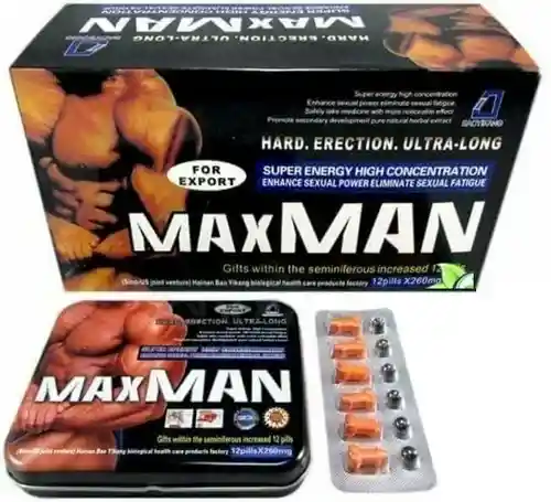 ¡¡¡TUS ENVIOS TOTALMENTE DISCRETOS!!! Esta publicación consta de 2 comprimidos Naranja y 2 comprimidos Negro comprimido potenciador (naranja) comprimido retardante (negro). MAXMAN Ultra Long es un producto 100% natural y un potente tónico herbal. Exclusiva Fórmula que rápida y naturalmente mejora la capacidad sexual masculina, prolonga y engrosa el pene de manera efectiva, entre otros beneficios. Es una fórmula concentrada y altamente efectiva para el cuidado de la salud y satisfacción sexual masculina. Las cápsulas de Max Man Ultra Long son un producto natural sin ninguna hormona, no tienen ningún efecto secundario y no causan daño al cuerpo humano. Dependiendo de la asimilación y el metabolismo de cada organismo puede prolongar y engrosar, efectivamente el pene. Elaborado totalmente a base de hierbas 100% naturales que proveen nutrientes al sistema reproductor masculino y a los riñones manteniendo los niveles óptimos de testosterona y hormonas de la glándula tiroides. Es hasta ahora el más eficaz y más fuerte de los productos de salud sexual para los hombres en el mundo, que rápidamente puede mejorar la capacidad sexual masculina, prolonga y engrosa el pene, efectivamente, trata la impotencia y mejora la vida sexual. Beneficios de tomar MaxMan Ultra Long: • Es un producto que le permitirá consolidar y endurecer su erección. • Elimina la Erección Débil, Evita y controla la Eyaculación Precoz. • Aumenta el volumen del semen y la fuerza de expulsión. • Es un producto 100% natural, por lo tanto no tiene contraindicaciones. • No produce efectos secundarios. • Ayuda a disfrutar al 100% de su sexualidad. • Trata la impotencia. • Disminuye el tiempo de recuperación entre orgasmos. • Fortalece los músculos del Pene, logrando una buena circulación sanguínea. • Aumenta la secreción de las células de los testículos y activa la función renal. • Previene Problemas de Cáncer de Próstata e Incontinencia. • Mejora Tu Autoestima, así como la Relación con Tu Pareja o Amantes. • Las capsulas son naturales y si dejas de tomarlas no perderás las ganancias. • Aumenta la potencia sexual en minutos, obteniendo erecciones firmes y duraderas. • Aumenta la sensibilidad y apetito sexual. • Incrementa la duración de la erección. MAXMAN te ofrece la oportunidad de aumentar el flujo de sangre en el tejido eréctil hacía los conductos sanguíneos, dándole a su pene la capacidad de alcanzar su tamaño natural completo. El consumo regular de Maxman te ayuda a equilibrar la energía yin (energía fria) y yang (energía caliente) del cuerpo humano y los sistemas reguladores fundamentales pueden beneficiarse manteniendo el funcionamiento óptimo con las dosis regulares. Modo de Uso: Se debe tomar un comprimido acompañado de una píldora de 10 a 30 minutos antes de la relación sexual para uso ocasional. Este producto viene empacado en caja metálica lujosa, por 12 comprimidos (en forma de pene), y 12 píldoras de efecto retardante (pastas negras) Si lo deseas como tratamiento, debes tomar MAXMAN una vez a la semana o también la puedes tomar dos veces a la semana, y se recomienda tomar con Agua Caliente o cualquier otra bebida Caliente, ya sea Café o Te. Debes tomar al mismo tiempo la Capsula y La Raíz (capsula redonda negra) con agua Caliente.