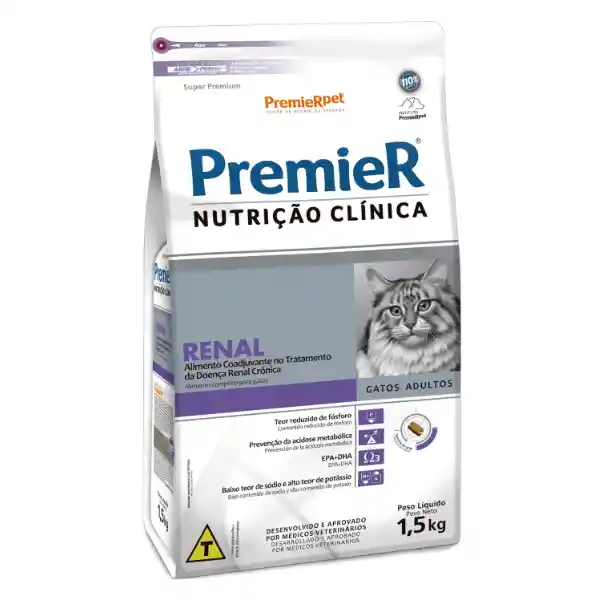 PremieR Nutrición Clínica Renal Gatos es un alimento de prescripción indicado para gatos adultos en tratamiento de la enfermedad renal crónica, Este producto debe ser utilizado como una terapia complementaria. Por lo tanto, no reemplaza el tratamiento convencional. Alimento completo para gatos