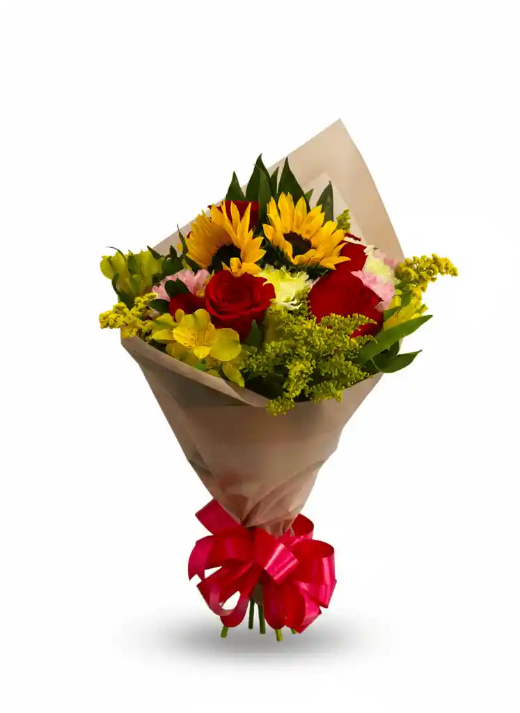 Hermoso Bouquet elaborado con girasoles, rosas rojas y una combinación de flores variadas. Un detalle alegre y romántico, perfecto para sorprender en un día especial como san valentin. Floristeria en Bogotá con entrega rapida, diseño elegante con papel decorativo y moño incluido.