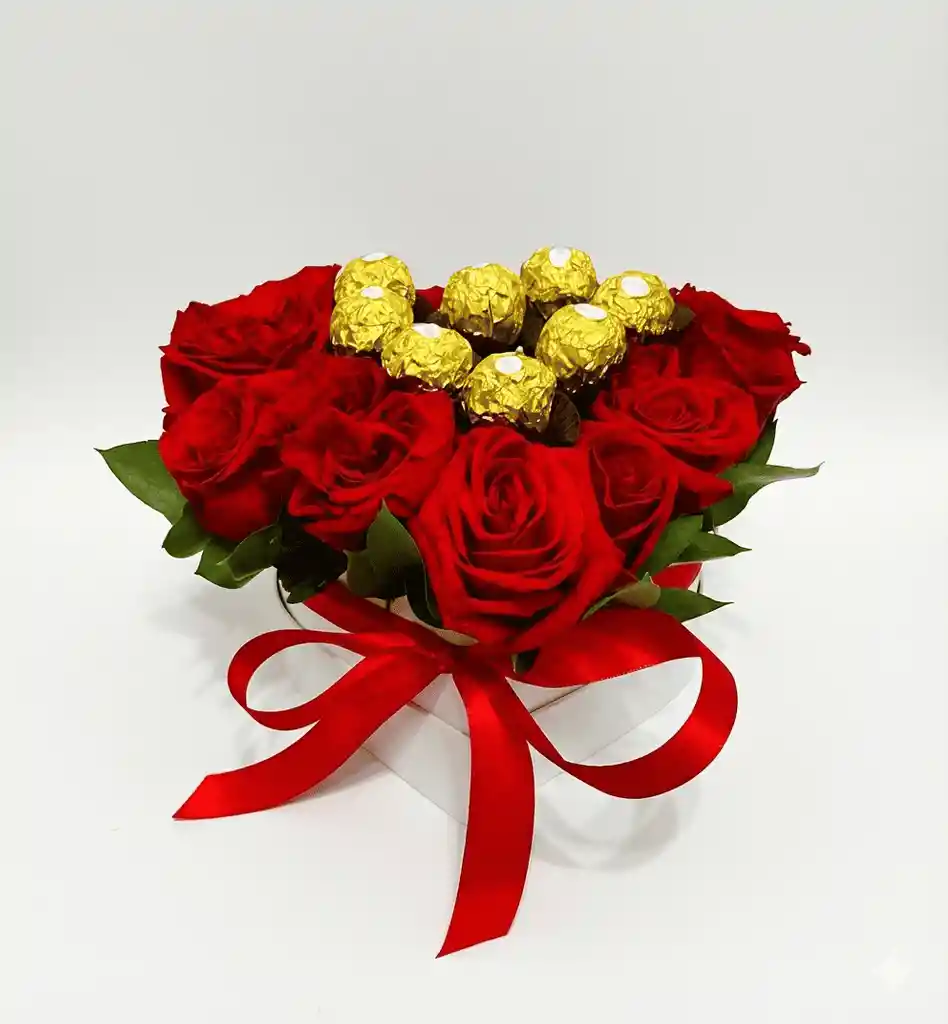 Arreglo en forma de corazón con 12 rosas rojas y 8 chocolates. Un detalle dulce y romántico para decir te amo en san Valentín.