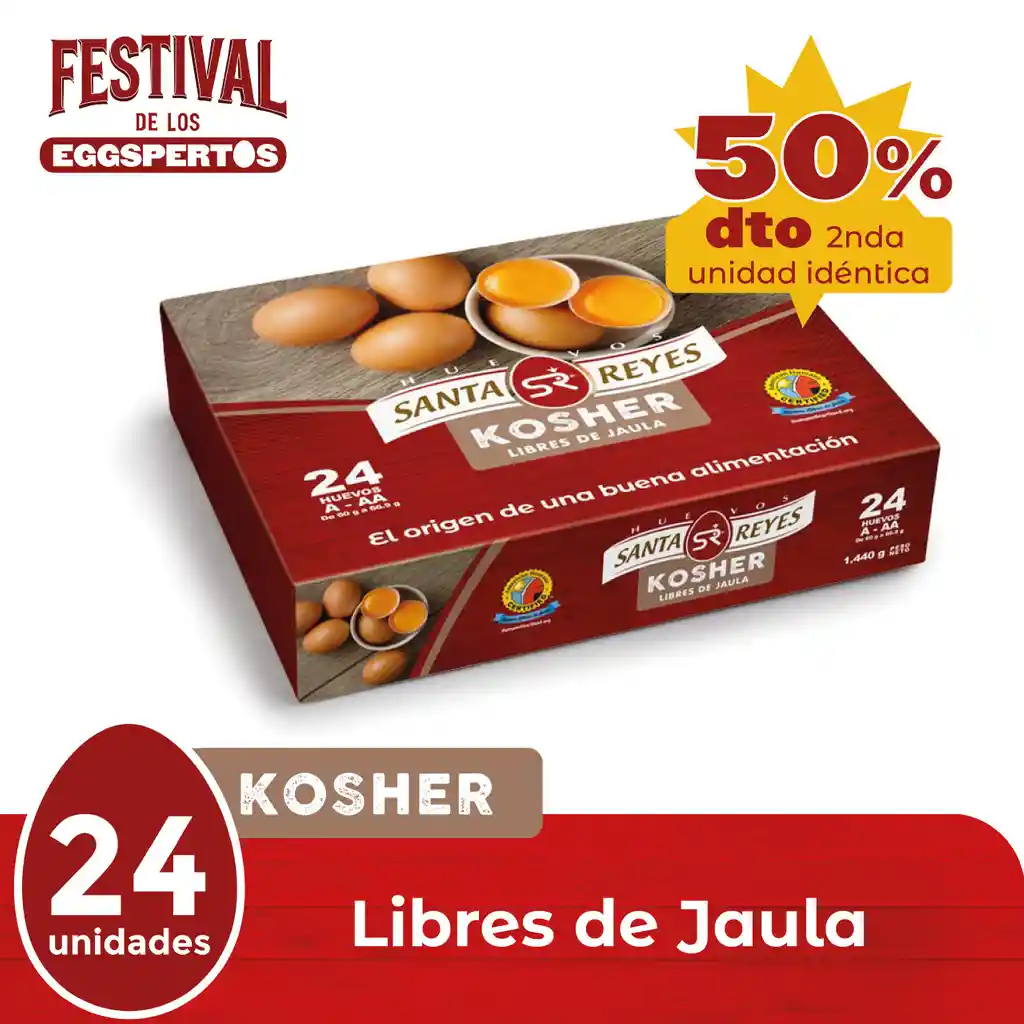PROMO 50% en 2nda unidad idéntica de deliciosos huevos certificados de gallinas libres de jaula por la organización norteamericana American Humane y Kosher por la comunidad judía, como cumplimiento de sus estándares de calidad.