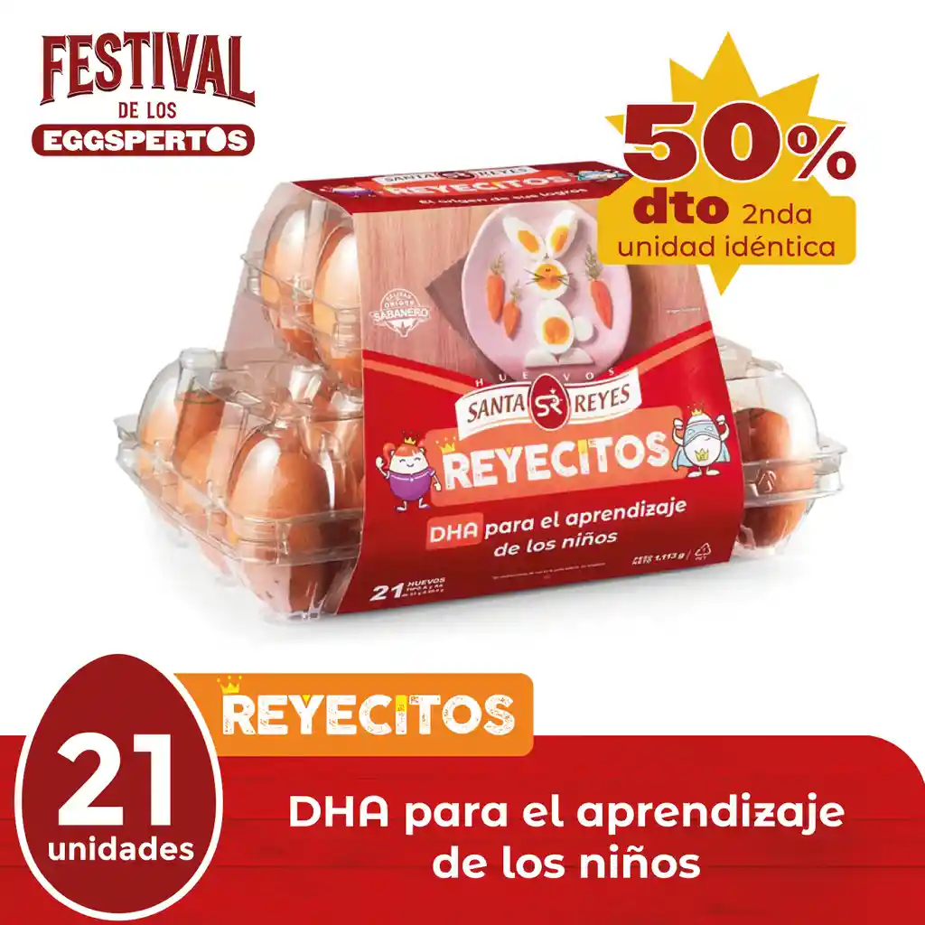 PROMO Huevos REYECITOS biofortificados con DHA, un ácido graso presente en la leche materna que aporta al desarrollo cognitivo de los niños y niñas, y buena fuente de ácido fólico, para fortalecer sus super poderes.
