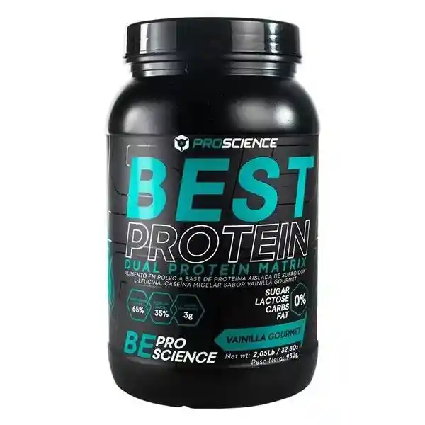 BEST PROTEIN no contiene azúcar, grasa, cabohidratos ni lactosa, lo cual lo hace una aliada perfecta. Por supuesto, hicimos muchísimas pruebas para dar con un sabor que debes probar. Es una mezcla 3 en 1, Proteína aisladade suero de leche de altísima calidad, Caseina Micelar (proteína de absorción lenta) y Leucina. 1 servicio de Best Protein (1 scoop) te brinda 26g de proteína y 3g de leucina – sin grasa, sin azúcar y sin carbohidratos. La pueden tomar niños y adultos mayores. Se puede usar para recetas como: Pancakes, batidos etc. Ingredientes: Proteína Aislada de Suero, Caseína Micelar, L-Leucina, Goma Guar, Vitamina C (Ácido Ascórbico), Vainilla Gourmet (Saborizante Idéntico al Natural), Stevia (Edulcorante), Dióxido de Silicio, Vitamina B6 (Piridoxina), Vitamina B1 (Tiamina), Vitamina D3. Presentación comercial: Envase y Liners interno de seguridad. Material del empaque: Envase plástico. Método de conservación: El producto debe estar almacenado en su empaque original a temperatura inferior a 30°C y a una humedad relativa inferior a 75%. No introducir elementos húmedos, después de abierto consumase en el menor tiempo posible. Contenido: Neto 2,04 lbs / 32.6 Oz. Servicios: 30 scoops por envase. Sabor: Vainilla Gourmet / Coco Blue / Chocolate Gourmet / Vainilla Blue / Fresa. Modo o método de consumo o preparación: Mezcla una cucharada de Best Protein con 5-6 onzas de agua (o leche para aumentar la cremosidad y las calorias). El momento ideal para tomarla es después del entrenamiento. También puedes tomar la proteína como bocadillo entre las comidas. Formato de Venta: Polvo.