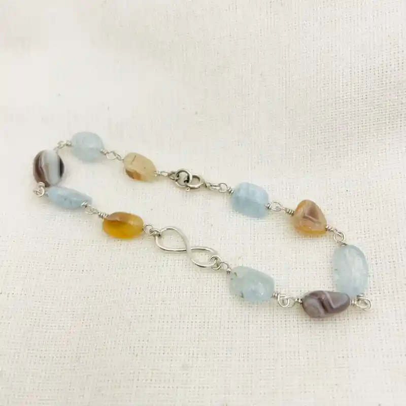 Pulsera con un símbolo de infinito al centro, acompañado de piedras Aguamariana y Agata naturales. La pulsera mide 19cm. de largo. Aguamarina: se asocia principalmente con la calma, la comunicación y la protección. Se cree que promueve la serenidad y el equilibrio emocional, alivia el estrés y la ansiedad, y facilita la expresión verbal y no verbal al estar conectada con el chakra de la garganta. Ágata: se considera que equilibra las energías, calma las emociones, fomenta la confianza en uno mismo y ayuda a superar bloqueos energéticos y la ansiedad. Su patrón de bandas, en particular, se asocia a menudo con el chakra del corazón, promoviendo la aceptación, la compasión y la paz interior, según Camille Ambiance Nature. El símbolo del infinito representa eternidad, continuidad y conexión sin fin. Su origen es matemáticamente atribuido a John Wallis en el siglo XVII, aunque su forma actual se debe a Johann Lambert. En la joyería, simboliza amor eterno y conexión duradera. Espiritualmente, representa la naturaleza cíclica de la vida y la unidad del universo.