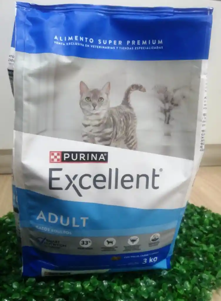 PURINA® Excellent® Adulto Pollo y Arroz, ofrece una fórmula con una óptima combinación de ingredientes, proteínas de alta digestibilidad y ácidos grasos omega 3 y 6, para mantener al máximo la salud del gato adulto.