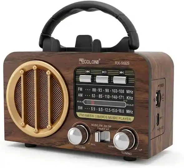 Ideal Para un regalo Revive la nostalgia con esta elegante Radio RX-966, diseñada con un acabado estilo madera clásico que combina perfectamente la estética retro con tecnología moderna. Su diseño compacto con manija de transporte la hace ideal para llevarla a cualquier lugar. Características Principales Tres Bandas de Radio: FM (88-108 MHz), AM (530-1710 KHz) y Onda Corta SW (5.9-18.0 MHz). Conectividad Bluetooth para transmitir música desde tu smartphone o tablet. Entradas USB y SD para reproducir tu música favorita directamente. Diseño Vintage Premium con acabado en madera, detalles dorados y perillas cromadas. Altavoz de Alta Calidad que ofrece sonido claro y potente con parrilla metálica dorada. Controles Analógicos con perillas de volumen y sintonía para ajuste preciso. Especificaciones Técnicas Potencia: 5W RMS de salida de audio. Batería: Batería recargable de litio 1200mAh. Autonomía: Hasta 6-8 horas de reproducción continua. Alimentación: Batería recargable o Corriente DC (cable incluido). Conectividad: Bluetooth, USB, Tarjeta SD, Entrada AUX. Dimensiones: Compacto y portátil con manija superior. Peso: Ligero para transporte fácil. Ideal Para Hogar como decoración vintage y entretenimiento diario. Exterior para camping, picnics y actividades al aire libre. Regalo perfecto para amantes de lo clásico y coleccionistas. Emergencias para mantenerte informado con radio AM/FM en cualquier situación. Contenido del Paquete 1 Radio RX-966. 1 Cable de carga USB. 1 Manual de usuario. Lleva el encanto del pasado con la tecnología del presente. Esta radio es más que un dispositivo de audio, es una pieza de decoración que añade carácter a cualquier espacio mientras disfrutas de tu música favorita con calidad de sonido excepcional.