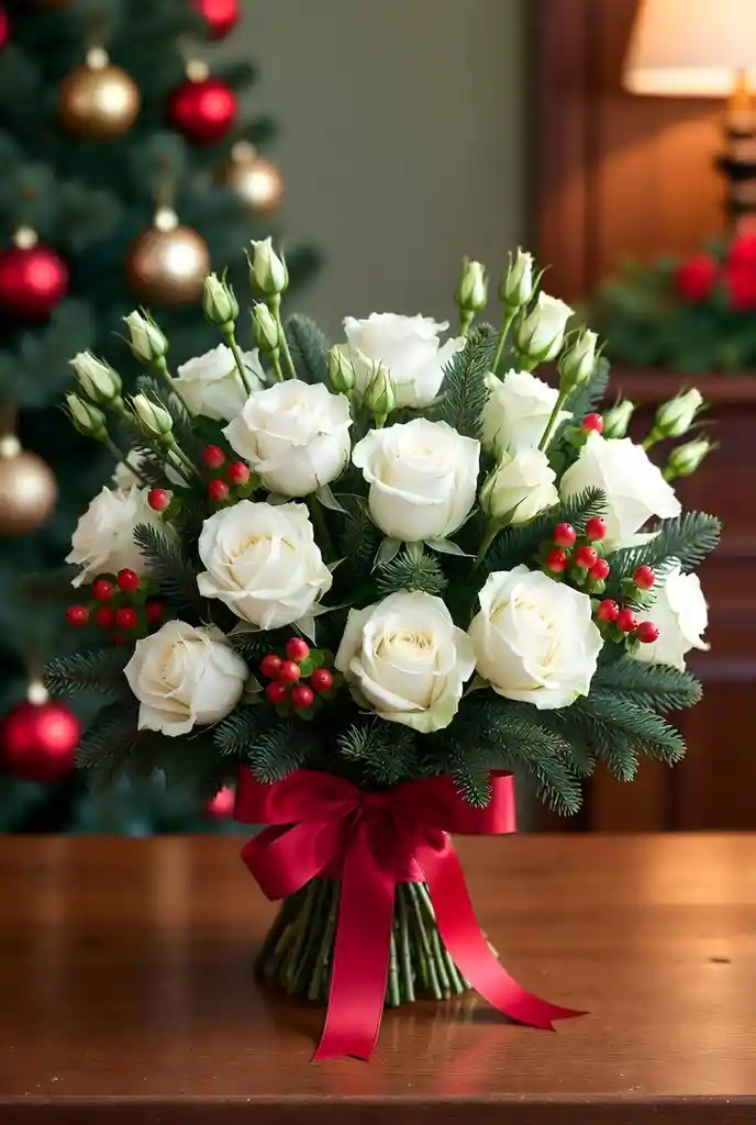 Un arreglo encantador que reúne rosas blancas de gran apertura, acompañadas de follaje de pino fresco y acentos de esferas rojas naturales que evocan la esencia de la Navidad. Su estructura compacta y elegante, finalizada con un listón rojo satinado, crea una pieza festiva que destaca por su pureza, equilibrio y estilo refinado. Ideal para decorar mesas navideñas, entradas o salas principales, así como para regalar un detalle que exprese paz, buenos deseos y sofisticación. Su combinación de tonos fríos y toques vibrantes aporta un ambiente cálido y armonioso durante toda la temporada decembrina.