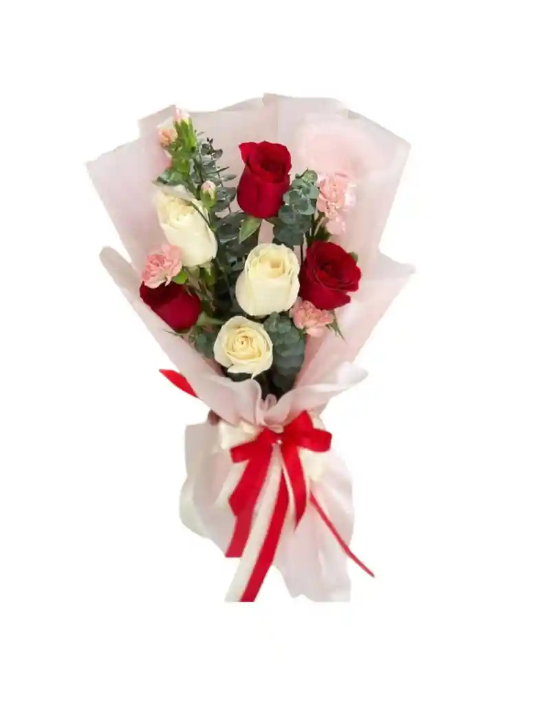 Ramillete compuesto por rosas frescas y claveles rosados, envuelto en elegante papel coreano y decorado con un hermoso lazo. Un detalle romántico y sutil, perfecto para expresar cariño y admiración en cualquier ocasión especial.