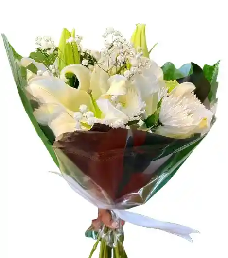 Ramo en papel bicolor con lirios blancos (capullos y flores), crisantemos tipo disbud blancos, gypsophila y follaje verde (según disponibilidad). Detalle sobrio y sofisticado ideal para aniversarios, ocasiones formales o condolencias. Presentación premium con listón e incluye tarjeta dedicatoria. Entrega rápida el mismo día.