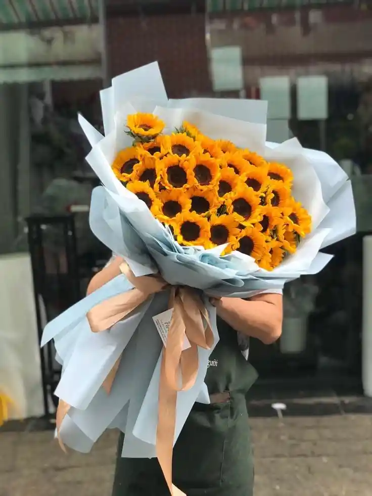 Ramo buchón de 40 girasoles Nota: La flor puede ser sustituida dependiendo la disponibilidad de color y del producto “Mensaje Personalizado” máximo de 30 caracteres (Dejar el mensaje en el chat, los comentarios no se previsualizan para la tienda por lo que si se dejan allí no podrá ser incluido).