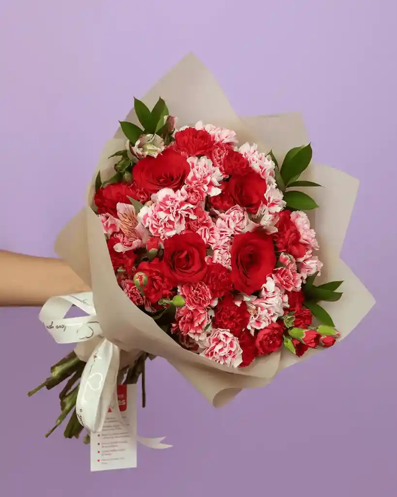6 rosas rojas frescas Claveles en colores mix Follajes de temporada que aportan volumen, frescura y armonía al arreglo floral. Envoltura con papel coreano Incluye una tarjeta de cortesía para agregar un mensaje único y memorable a tu detalle. Altura aproximada: 45 cm