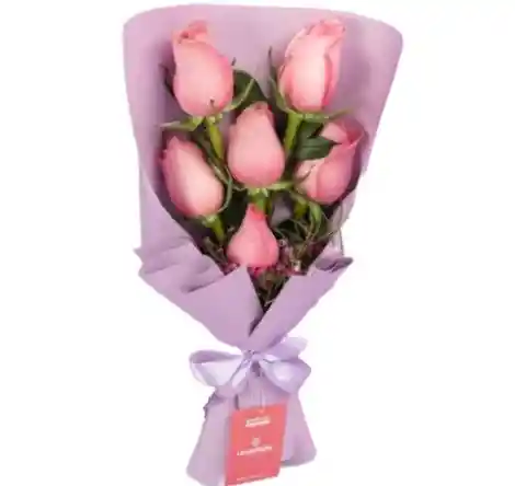 Bouquet alargado de 6 rosas rosadas acompañadas de follaje, decoradas con papel y moño