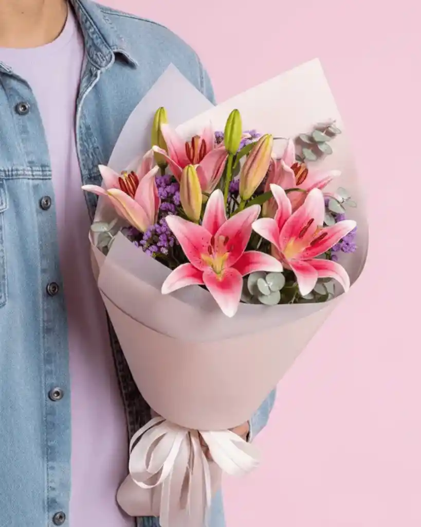Delicado ramo petit de lirios frescos, que combina elegancia y frescura en un detalle compacto y encantador. Perfecto para regalar ternura, gratitud o simplemente para alegrar cualquier espacio con su belleza natural. Especificaciones 2 tallos de lirios rosados premium Flores de complemento en tonos lilas y verdes. Tarjeta de cortesía en la que podrás dedicarle unas bellas palabras de amor. Envoltura con papel coreano. Altura aproximada: 45 cm