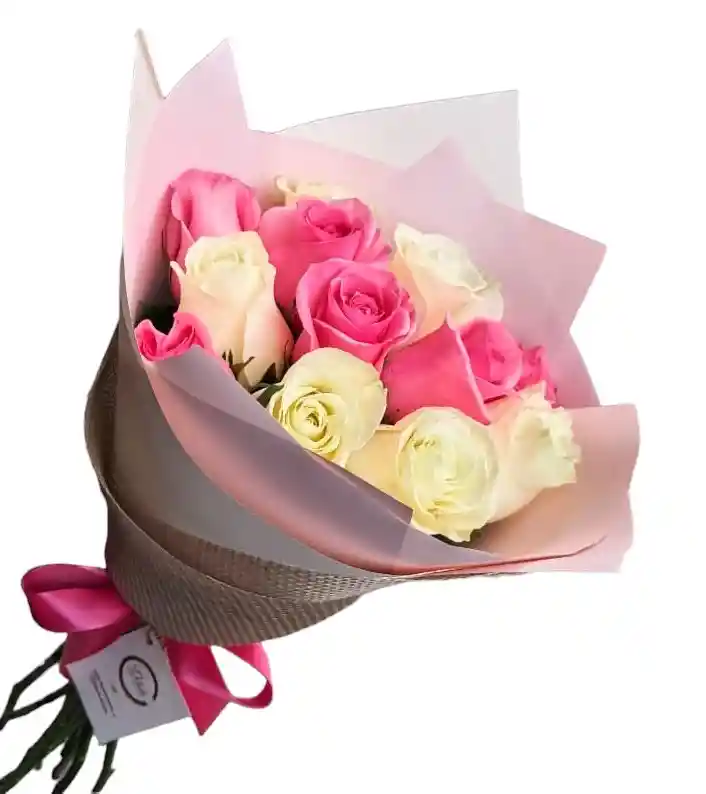 Bouquet redondo de 12 rosas rosadas y blancas acompañadas de follaje, decoradas con papel y moño