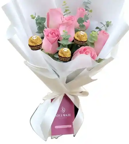 6 rosas rosadas en bouquet redondo y 3 unidades de chocolates Ferrero Rocher con follaje, papel y moño