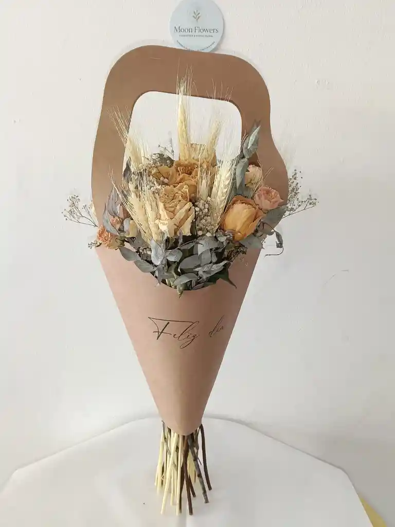 Ramo seco elaborado con mini rosas, eucalipto, gipso y espigas elegante en color pastel