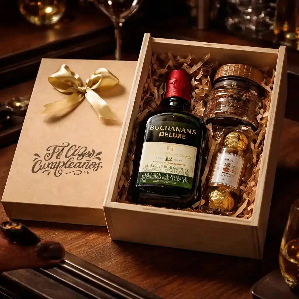 Caja madera, Buchanams 375ml, Cafe Juan Valdez 50gr y Ferrero x 3