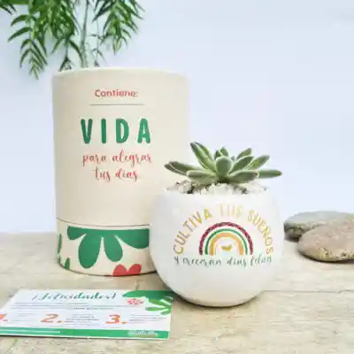 Las personas que quieres pueden cultivar sus sueños simbólicamente con esta plantita . ¡Regala vida! Incluye: Matera blanca de cerámica con mensaje estampado “Cultiva tus sueños y crecerán días felices” Suculenta natural sembrada Instrucciones de cuidado Caja de regalo que se convierte en alcancía