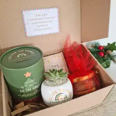 Todos los elementos para iniciar un nuevo año están en esta cajita acompañados de una planta natural del diseño que más te guste. Incluye: Matera de cerámica con diseño Cultiva tus sueños y planta suculenta natural sembrada Caja de regalo navideña que se vuelve alcancía. Galletas del corazón (hojaldre) 265 gr con decoración. Caja de 30 frases motivacionales inspiradas en la naturaleza. Caja de regalo. Tarjeta de cuidados. Dimensiones: Matera y suculenta: Diámetro 6 cm x Alto 8.5 cm. Frases: 7×7 cm Caja: 24x16x10 cm