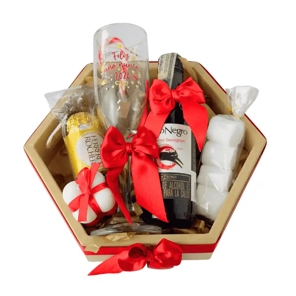 “Dulce Brillo” es un regalo navideño premium ideal para sorprender con un detalle elegante y lleno de sabor; incluye un vino Piccolo de 185 ml 🍷, una copa 2026 brillante 🥂, un Ferrero por 3 unidades 🍫✨, masmelos suaves, un bastón dulce 🍭, una vela aromática tipo regalo y una base en madera que realza la presentación con un toque cálido y sofisticado. Es una opción perfecta para clientes, colaboradores, parejas o familiares que buscan un detalle festivo, delicado y con muy buena presentación en esta temporada. Te podemos obsequiar una tarjeta si nos envías el mensaje para que acompañes tu detalle.