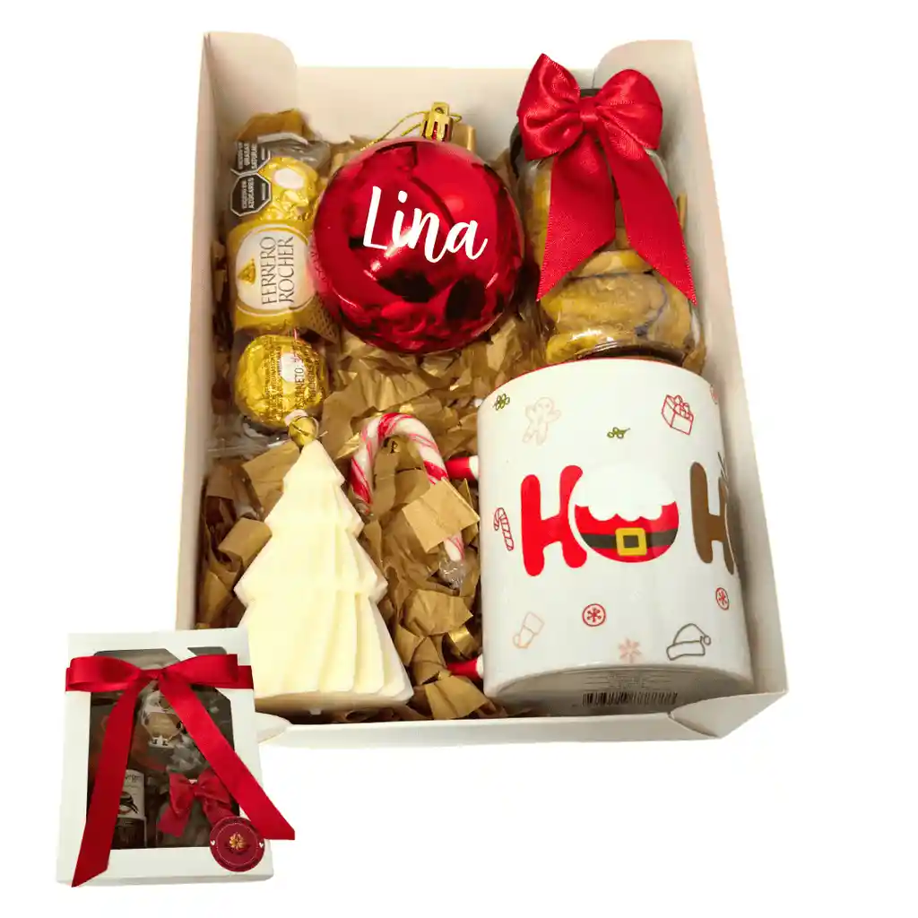 “Regalo Perfecto” es un regalo navideño premium ideal para sorprender con un detalle cálido, dulce y lleno de encanto; incluye un mug navideño 🎄, un tarro de galletas navideñas 🍪, chocolates Ferrero por 3 unidades 🍫✨, una bola navideña personalizada, una vela aromática en forma de árbol 🌲, un bastón de dulce 🍭 y una caja decorativa que realza la presentación con un toque festivo y elegante. Es una opción perfecta para colaboradores, clientes, amigos o familiares que disfrutan los regalos cuidados y llenos de espíritu navideño. Te podemos obsequiar una tarjeta si nos envías el mensaje para que acompañes tu detalle.