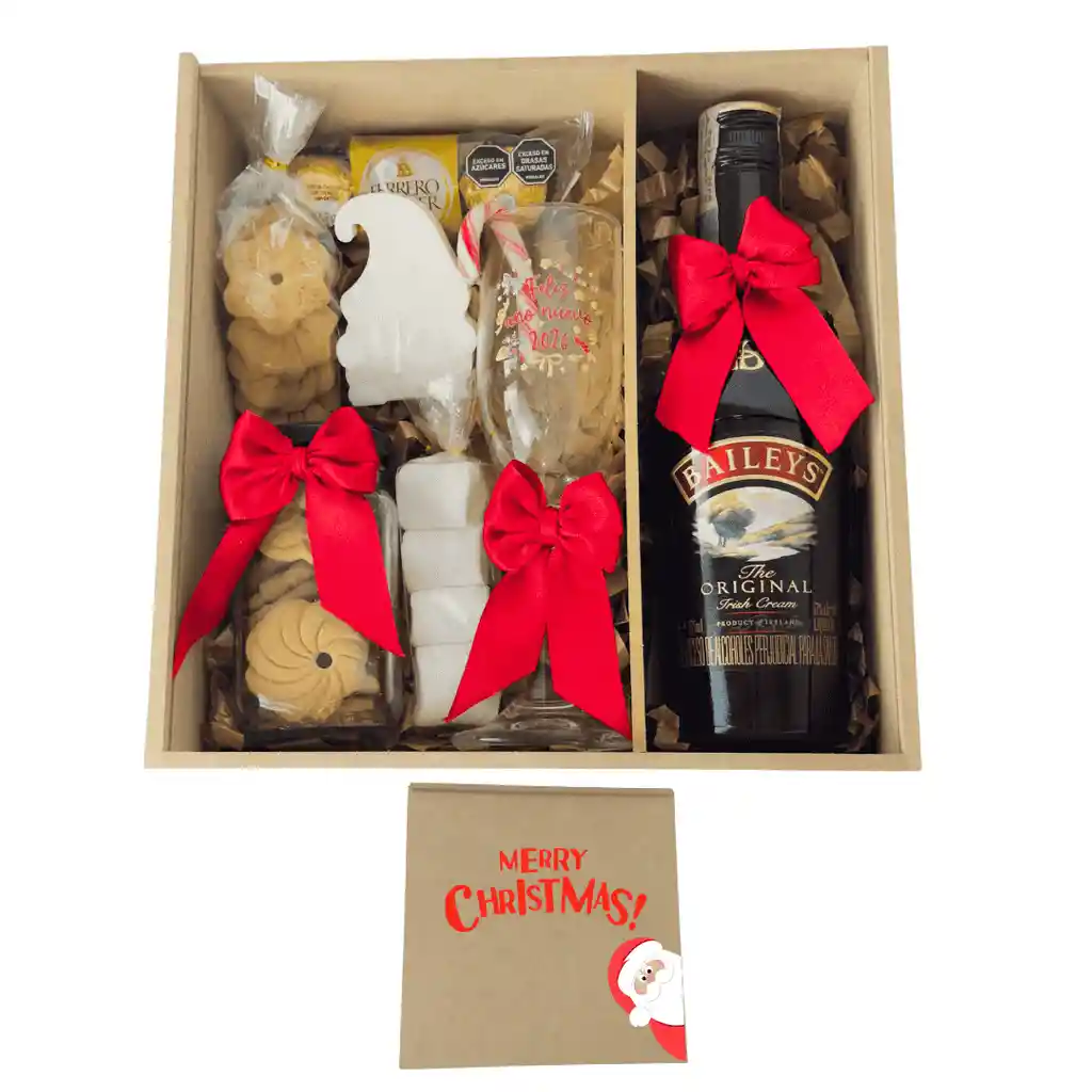 “Toque Dorado” es un regalo navideño premium ideal para sorprender con un detalle elegante, dulce y lleno de encanto; incluye una botella de Baileys de 375 ml 🥃, una copa 2026 brillante 🥂, una vela navideña aromática ✨, una bolsita de masmelos suaves, un tarro de galletas 🍪, una bolsa de pistachos, un Ferrero por 3 unidades 🍫 y un bastón dulce 🍭, todo presentado en una caja de madera con tapa que realza la presentación con un toque sofisticado y festivo. Es una opción perfecta para clientes VIP, colaboradores especiales, parejas o familiares que disfrutan los detalles navideños cuidados y con estilo. Te podemos obsequiar una tarjeta si nos envías el mensaje para que acompañes tu detalle.