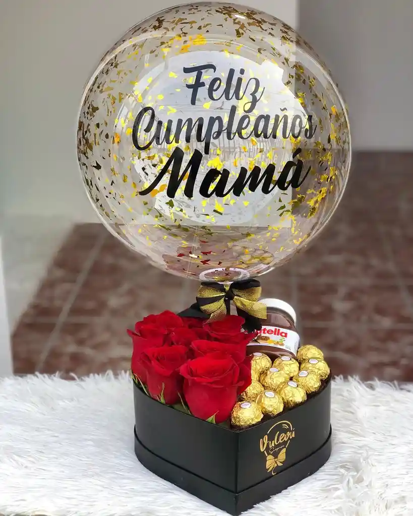 Anchetas, desayunos sorpresa y detalles para cumpleaños, aniversario, amor y amistad, Día de la Madre, Mujer, Niño, Navidad y San Valentín. Incluye flores, chocolates, peluches y fresas con chocolate. Contenido: - Rosas - Globo burbuja personalizado - Chocolates - Frasco de nutella - Tarjeta personalizada Adiciones: - Globo burbuja marcado 15,000 - Arreglo floral 50.000 - Peluches desde 20.000