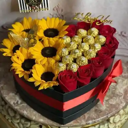 -corazón con chocolates -girasoles, rosas -tarjeta dedicatoria Adiciones: - Globo burbuja marcado 15,000 - Arreglo floral 50.000 - Peluches desde 20.000