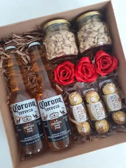 2 cervezas chocolates ferreros rosas frutos secos Adiciones: - Globo burbuja marcado 15,000 - Arreglo floral 50.000 - Peluches desde 20.000