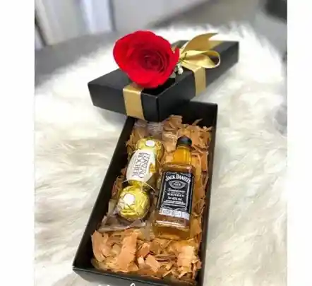 mini botella Jack Daniels ferreros tarjeta personalizada caja decorada Adiciones: - Globo burbuja marcado 15,000 - Arreglo floral 50.000 - Peluches desde 20.000