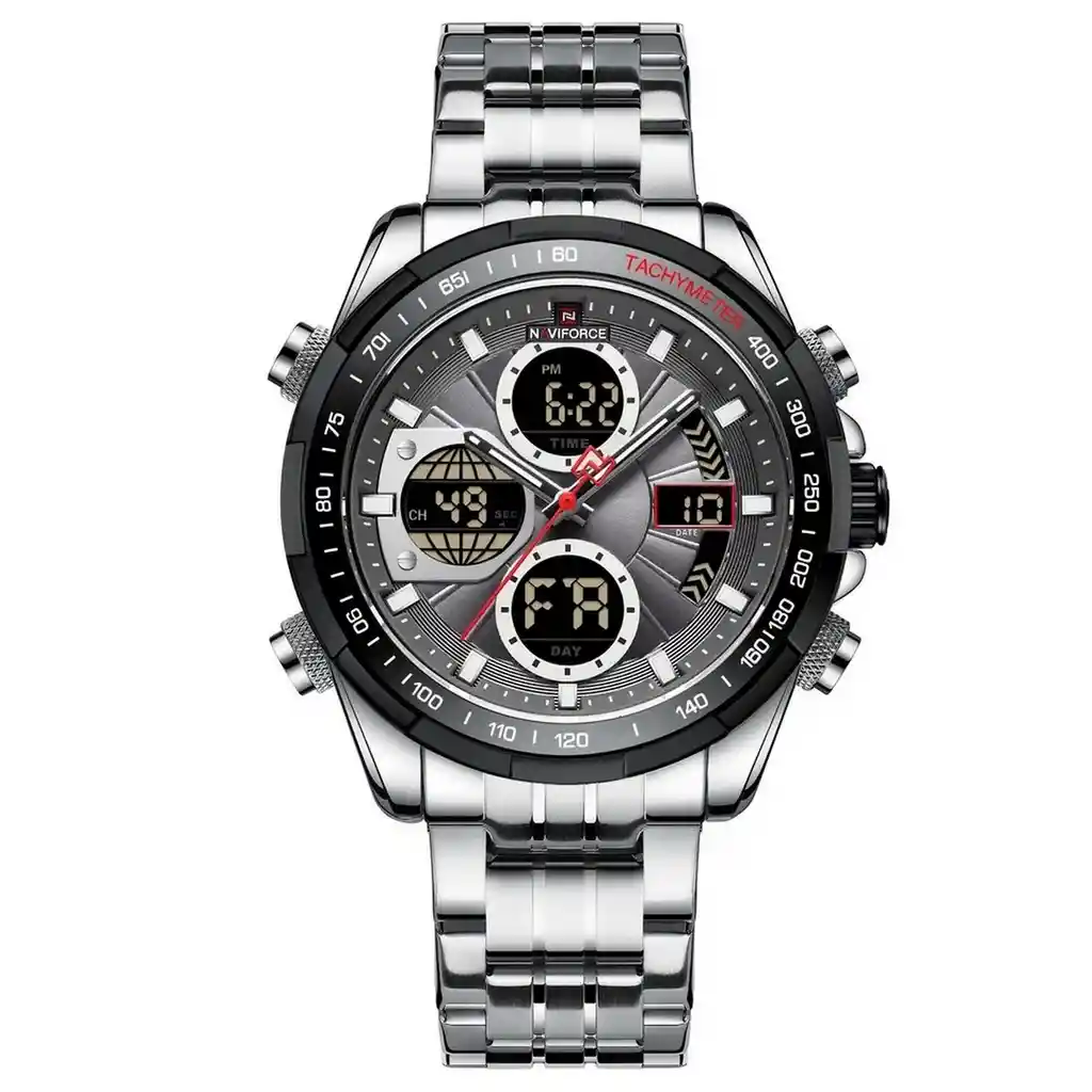 Los mejores relojes te los trae la marca Naviforce con sus sorprendentes estilos que definitivamente te enamoraran. Todos sus diseños son inspirados en la comodidad y satisfacción del cliente, ofreciéndote relojes con materiales de la más alta calidad, estilos innovadores y de cualidades inigualables. El reloj Naviforce es un accesorio indispensable que cumplirá con todas las expectativas que buscas en un reloj, uniendo lo mejor de la moda y destacando tu belleza a la hora de portarlo, con su correa en acero elegante de lujo te brinda un toque refinado para lucir y combinar muy bien con todos tus looks diarios. /// El reloj incluye su estuche original y tarjeta de garantía. /// Ficha Técnica Muestra día, fecha, hora, Luz de Fondo, Alarma Doble núcleo con pantalla digital y analógica Modo cronógrafo de vuelta 1/100 Resistencia al agua de 3ATM (solo exposición accidental al agua No ducha, No se puede sumergir, No usar en actividades acuáticas). Tipo de cierre: Enganche de pulsera Material de la caja: Metal Diámetro: 4.6 cm Ancho correa: 2.2 cm Grosor de la caja Espesor del estuche: 1.7 cm Material de la correa banda: Acero Inoxidable Longitud de La correa: 24 cm Peso neto: 185g Términos de garantía: Términos de garantía: _Para defectos de fábrica o retractos: _Por favor revise el producto apenas lo reciba y antes de usarlo. No aplican ley de retracto o defectos de fábrica luego de usar el producto. Se manejan máximo 5 días para reportar defectos de fábrica (por ejemplo, piezas faltantes, rotas, etc). En cuanto a maquinaria se da tres meses de garantía, es decir el buen funcionamiento del producto. Para hacer efectiva la devolución el producto debe devolverse con el empaque original, el cual debe estar en buen estado, incluir todos los documentos y las partes completas y sin daños.