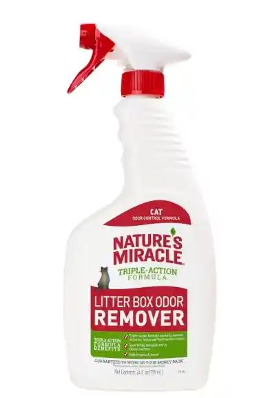 El Nature's Miracle Cat No Más Marcas Spray de 24 oz (709 ml) es un limpiador enzimático de doble acción diseñado para eliminar manchas y olores de orina, heces y vómito. Además de limpiar, su fórmula actúa como repelente natural con aroma a limoncillo y canela para disuadir a los gatos de volver a marcar la misma zona