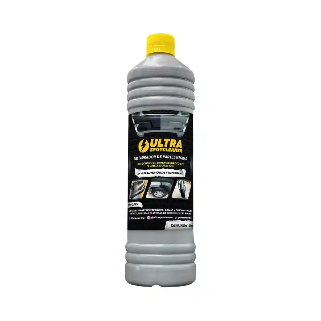 Nuestro Restaurador de Partes Negras para Interiores/Exteriores ULTRA SPOTCLEANER, es un producto biodegradable, que ha sido creado y especialmente formulado, para devolver el color original a las partes negras externas e internas de su auto, proporcionándole una capa plastificante y dándole mayor protección y durabilidad. MODO DE USO: - Lave su vehículo y seque muy bien. - Aplique una capa uniforme de nuestro Restaurador e Hidratador de Partes Negras para Interiores Ultra Spotcleaner. - Con un paño de microfibra seco, frote suavemente y obtendrá un color original. APLICACIONES: - Industria: Grandes superficies (mall, edificios, salas de exposición), trenes, aviones, montacargas. - Institucional: En autolavados, motolavados y talleres detailing, sobre las superficies de hule, compactos, plásticas, fibra de vidrio, etc.