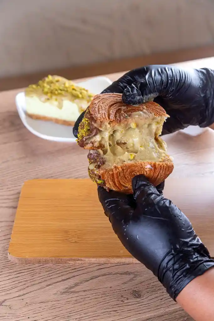 Croissant roll relleno de ganache de pistacho, con trozos de pistacho y cobertura de chocolate. Nivel de dulce: Alto