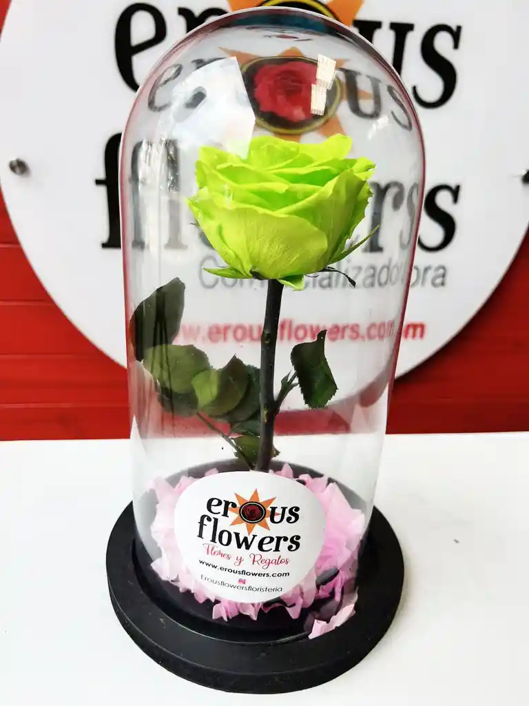 Rosa preservada color verde, con duración de 1 a 5 años según el cuidado, presentada en cúpula de vidrio de 30 cm; no mojar, no exponer al sol ni a la humedad, no retirar la cúpula y mantener en luz ambiente del hogar, ideal como detalle elegante y duradero. 🌹