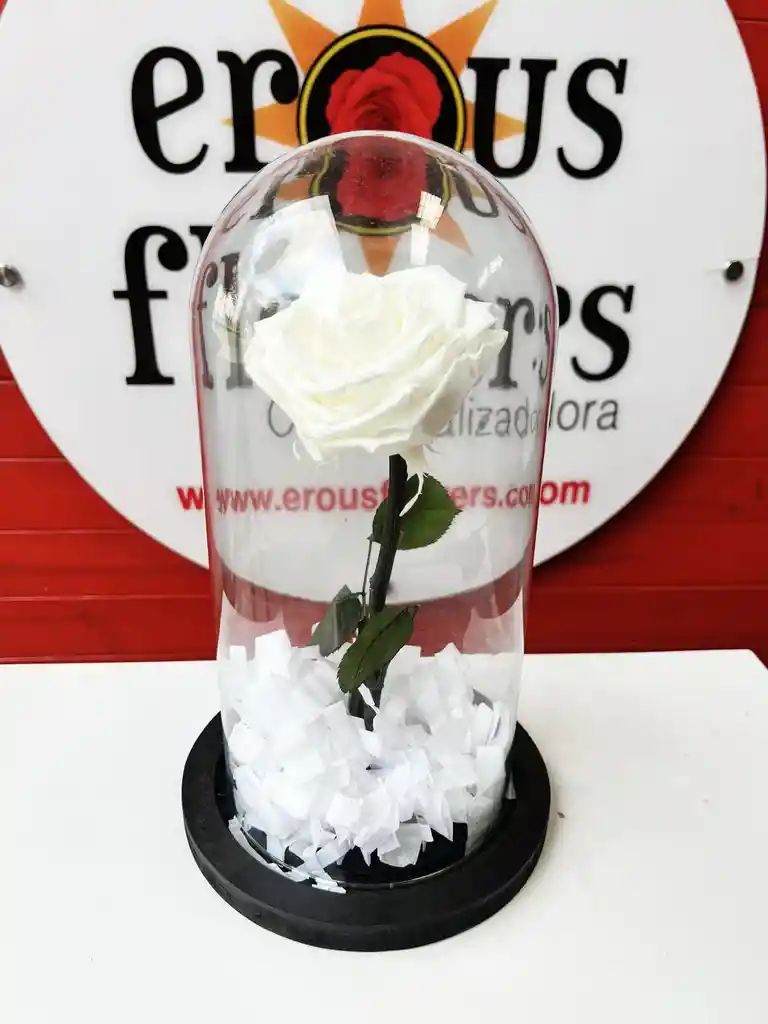 Rosa preservada color blanco, con duración de 1 a 5 años según el cuidado, presentada en cúpula de vidrio de 30 cm; no mojar, no exponer al sol ni a la humedad, no retirar la cúpula y mantener en luz ambiente del hogar, ideal como detalle elegante y duradero. 🌹
