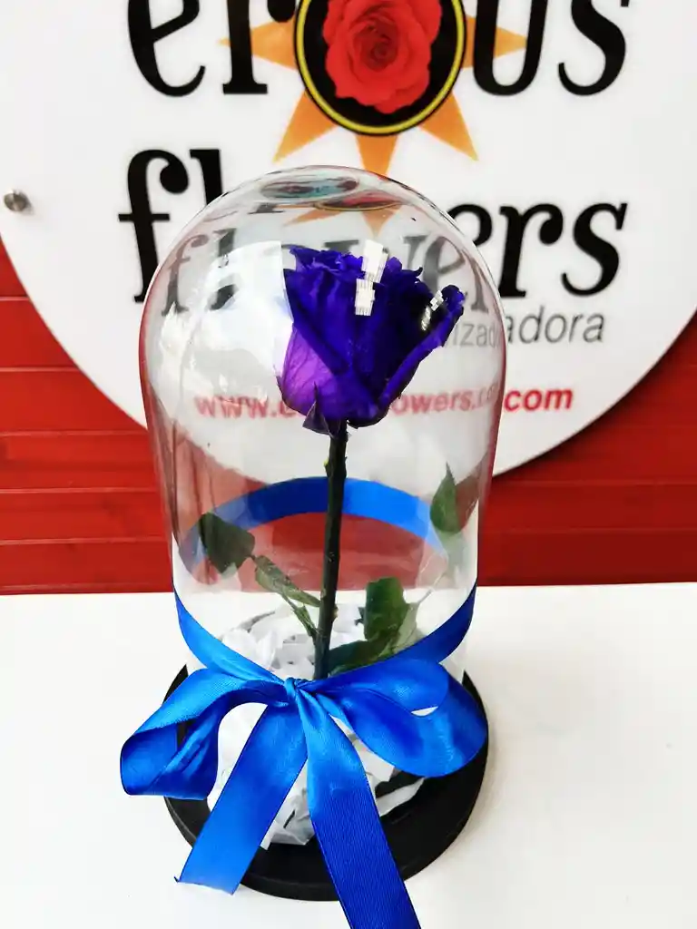 Rosa preservada color morado, con duración de 1 a 5 años según el cuidado, presentada en cúpula de vidrio de 30 cm; no mojar, no exponer al sol ni a la humedad, no retirar la cúpula y mantener en luz ambiente del hogar, ideal como detalle elegante y duradero. 🌹