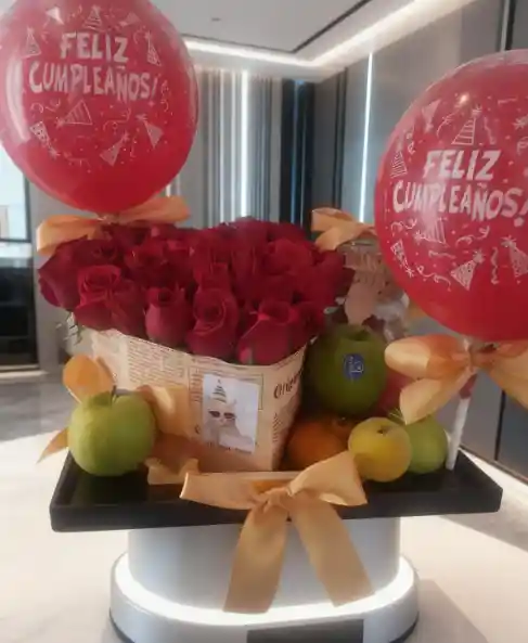 Contenido: 4 Manzanas 1 Bandeja de Madera 1 Café 2 Duraznos 2 Mandarinas 1 Maní Salado 1 Figura de corazón + Rosas 1 Tarjeta Personalizada