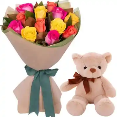 contiene: rosas amarillas x4 , rosas fucsias x4, rosas naranjas x4 con un oso pequeño en bouquet incluye decoración y mensaje personalizado Nota el peluche puede variar según disponibilidad
